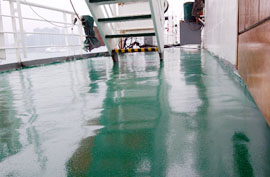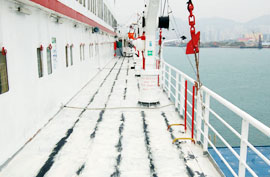 接到該訂單后,公司派一支素質過硬的施工隊伍奔赴香港開始作業(yè),由于期間香港天氣變化反復,時常下雨;待基面底漆頑固,銹跡斑斑難以清理,均為凹凸不平的麻面;再加上該郵輪白天需正常營業(yè),施工多只能在晚上進行,等等一系列因素都給施工帶來了嚴峻考驗。青龍公司歷來重視每一筆訂,注重每一個細節(jié),董事長宋敦清先生得知后,親自前往,與公司總工徐新生論證了一個最佳方案后開始指導施工,考慮到施工部位特殊,長期在海面上風吹日曬,最后選用了其耐候、耐酸堿、耐紫外線、耐老化、耐霉菌、耐鹽霧、耐臭氧、耐溶劑、耐磨、耐沖擊和耐油性等綜合性能優(yōu)異的CQ101防水密封涂料。先用特殊纖維填充10mm高度,再在上面找平3mm厚,然后用青龍CQ101防水密封涂料自流平成膜。經(jīng)過一個星期的艱苦奮戰(zhàn),順利完成施工。