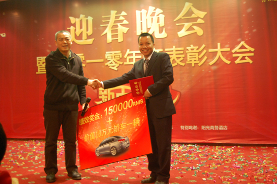 練祖耀(圖右),男,27歲,2009年9月加入青龍營銷團隊,經(jīng)過自己勤奮學(xué)習(xí),積極進(jìn)取,2010年個人業(yè)績榮膺榜首,獲青龍"優(yōu)秀業(yè)務(wù)員"稱號,年終青龍董事長宋敦清先生(圖左)獎其現(xiàn)金15萬和價值10萬元小車一輛。