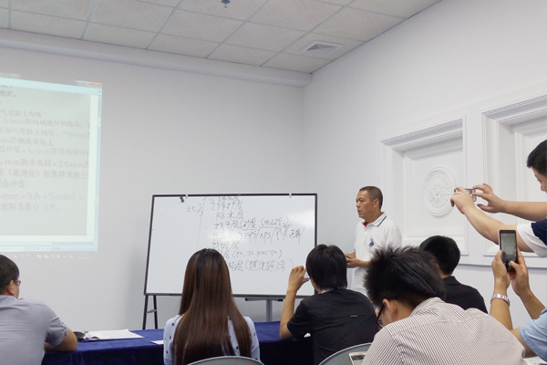 會議的之后,為提升公司業(yè)務(wù)人員防水等專業(yè)水平,培養(yǎng)解決各種復(fù)雜防水難題的能力和自信心,公司董事長宋敦清先生親自言傳身教,以地下室底板、地下室頂板、地下室側(cè)墻、屋面等防水設(shè)計方案為參照,引導(dǎo)大家共同設(shè)計出最有效,最經(jīng)濟的防水保溫設(shè)計,鼓勵大家轉(zhuǎn)變觀念,靈活應(yīng)用。宋總的講解讓大家受益匪淺,也深深理解了防水專業(yè)知識的重大意義。