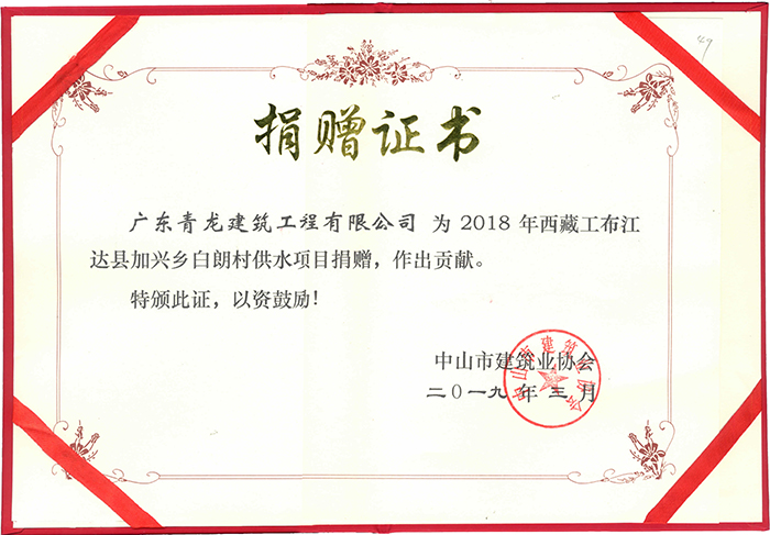 3月28日,在中山市建筑業(yè)協(xié)會(huì)第七屆二次會(huì)員大會(huì)暨工程創(chuàng)優(yōu)表彰大會(huì)上,由市住建局主導(dǎo)的支援西藏工布江達(dá)縣項(xiàng)目,由于青龍支持得力,受到市住建局和建筑業(yè)協(xié)會(huì)的高度表彰,被頒發(fā)榮譽(yù)證書。