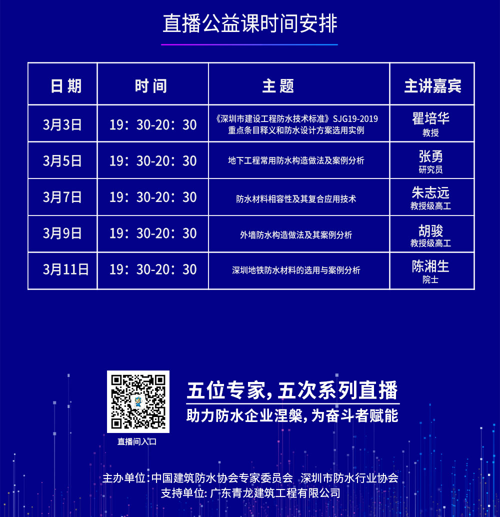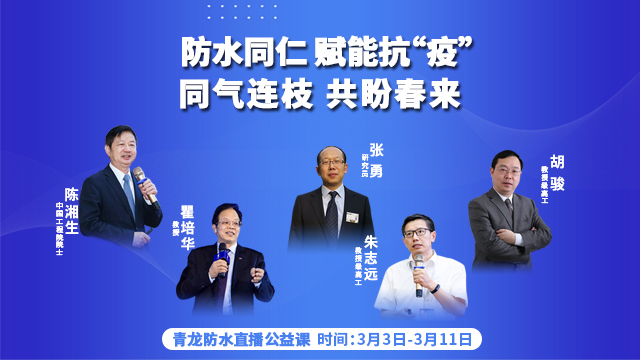 本次防水公益直播是為貫徹落實(shí)黨中央關(guān)于新冠肺炎疫情防控工作的決策部署,積極響應(yīng)各級(jí)政府的號(hào)召,由中國(guó)建筑防水協(xié)會(huì)專家委員會(huì)、深圳市防水行業(yè)協(xié)會(huì)主辦,廣東青龍建筑工程有限公司協(xié)辦,直播由陳湘生院士領(lǐng)銜,瞿培華教授、張勇博士、朱志遠(yuǎn)教授和胡駿教授4位專家支招,助力防水企業(yè)涅槃,為奮斗者賦能,讓我們防水人同氣連枝,共盼春來(lái)。