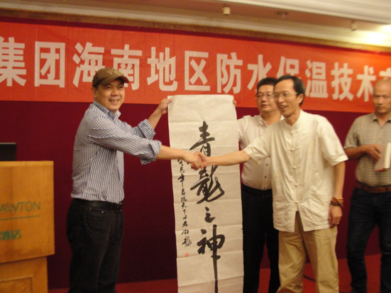 北京聯(lián)合大學(xué)易學(xué)與經(jīng)濟(jì)發(fā)展研究中心副主任、北師大易學(xué)文化講師游三林教授做“建筑學(xué)、居家與風(fēng)水”主題的演講,為現(xiàn)場(chǎng)的參會(huì)者解答疑惑。演講完畢后,游教授現(xiàn)場(chǎng)將一副名為“青龍之神”的毛筆字贈(zèng)與青龍集團(tuán)董事長宋敦清。