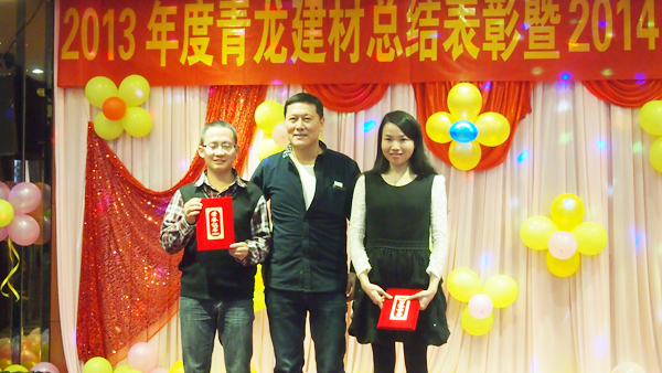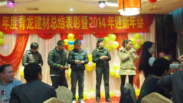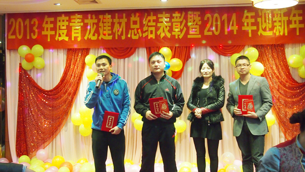 晚宴上,青龍廣西分公司韋流武先生代表集團(tuán)董事長(zhǎng)宋總致晚宴開(kāi)幕辭并送上新年祝福。韋經(jīng)理總結(jié)了2013年青龍廣西化學(xué)建材的發(fā)展歷程,肯定了2013年所取得的成績(jī),并對(duì)2014年寄予了美好展望。之后對(duì)2013年青龍廣西化學(xué)建材表現(xiàn)優(yōu)異的員工進(jìn)行表彰,鼓勵(lì)大家向他們學(xué)習(xí),繼續(xù)為生產(chǎn)中國(guó)較好的防水材料而奮斗。
