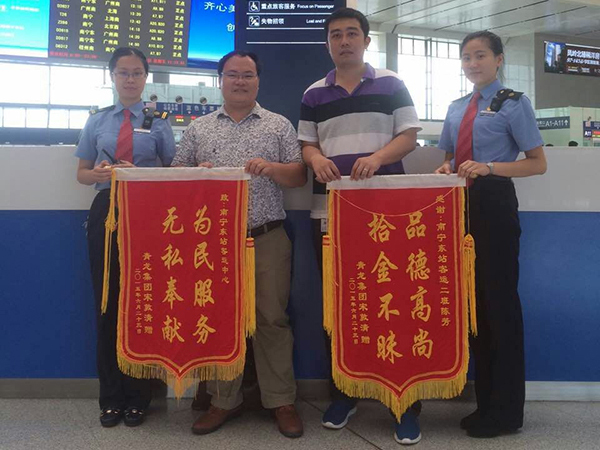 近日,青龍集團(tuán)廣西公司行政部經(jīng)理韋流武先生、設(shè)計(jì)院推廣經(jīng)理周明先生受青龍集團(tuán)宋先生之托,一行二人專程來(lái)到南寧東站客運(yùn)中心,將繡有“為民服務(wù),無(wú)私奉獻(xiàn)”和“品德高尚,拾金不昧”的大紅錦旗送到南寧東站領(lǐng)導(dǎo)和二班陳芳女士手中,衷心感謝動(dòng)車南寧東站全體工作人員的真誠(chéng)幫助和優(yōu)質(zhì)服務(wù),感謝陳芳女士品德高尚,拾金不昧的精神,并為她們的正能量點(diǎn)贊!
