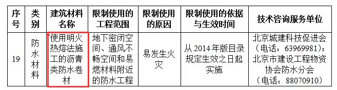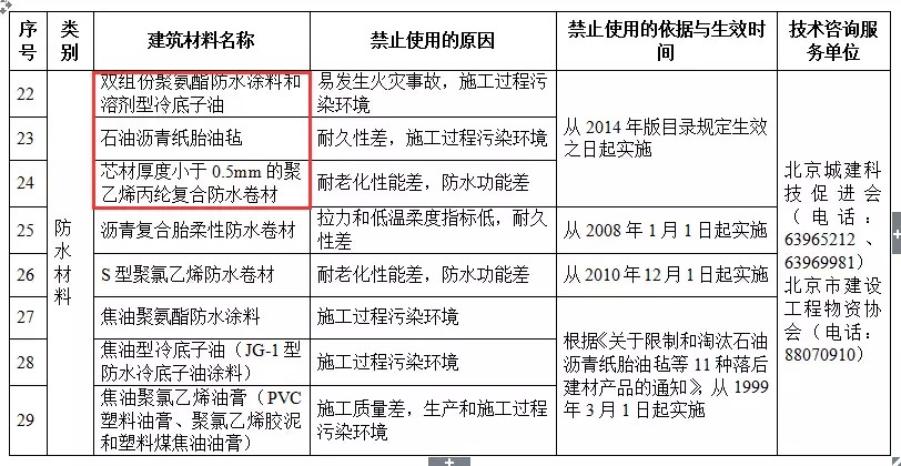 2014年版目錄共分推廣使用的建筑材料、限制使用的建筑材料和禁止使用的建筑材料三部分。在9種推廣使用的建筑材料中,無一建筑防水類材料;在31種限制使用的建筑材料種,使用明火熱熔法施工的瀝青類防水卷材被禁止使用;在54種禁止使用的建筑材料中,雙組份聚氨酯防水涂料和溶劑型冷底子油、石油瀝青紙?zhí)ビ蜌帧⑿静暮穸刃∮?.5mm的聚乙烯丙綸復(fù)合防水卷材等8種防水材料被禁止使用。
