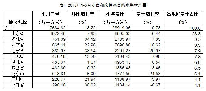 為進(jìn)一步了解我國瀝青和改性瀝青防水卷材產(chǎn)量,國家統(tǒng)計(jì)局對(duì)產(chǎn)量較大的176家防水企業(yè)進(jìn)行統(tǒng)計(jì),1-5月,瀝青和改性瀝青防水卷材產(chǎn)量為28919.06萬平方米,同比增長0.78%;其中山東地區(qū)產(chǎn)量較大,為6895.33萬平方米,同比下降6.44%,占全國累計(jì)產(chǎn)量的23.8%。