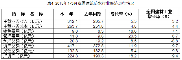 對(duì)全國491家主營業(yè)務(wù)收入在2000萬元以上的企業(yè)進(jìn)行統(tǒng)計(jì),資料顯示,1-5月,防水行業(yè)企業(yè)累計(jì)主營業(yè)務(wù)收入312.1億元,同比增長5.5%,增幅高于全國建材工業(yè)2.3個(gè)百分點(diǎn)。主營業(yè)務(wù)成本增幅略高于全國建材工業(yè)。利潤總額為20.8億元,同比增長8.5%,全國建材工業(yè)利潤總額負(fù)增長,同比下降8.8%。