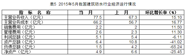5月,防水企業(yè)主營業(yè)務(wù)收入為77.5億元,環(huán)比增長15.10%。利潤總額為5.1億元,環(huán)比下降6.11%。
