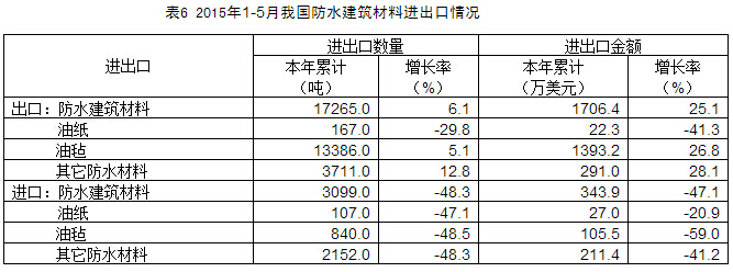 1-5月,建筑防水材料出口17265.0噸,同比上升6.1%;出口金額為1706.4萬美元,同比上升25.1%。