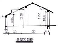 單(多)層建筑物的坡屋頂內(nèi)空間,當(dāng)設(shè)計(jì)加以利用時,其凈高超過2.1m的部位應(yīng)計(jì)算全面積;凈高在1.2m至2.1m的部位應(yīng)計(jì)算1/2面積;凈高不足1.2m的部位不應(yīng)計(jì)算面積。設(shè)計(jì)不利用時不應(yīng)計(jì)算面積。這里我將這種算法簡稱為“凈高界限計(jì)算法”。凈高是指樓面或地面至上部樓板(屋面板)底或吊頂?shù)酌嬷g的垂直距離。如圖2:第(1)部分凈高<1.2m,不計(jì)算面積;第(2)、(4)部分1.2m≤凈高≤2.1m,計(jì)算1/2面積;第(3)部分凈高>2.1m,應(yīng)全部計(jì)算面積。