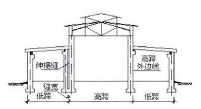 高低聯(lián)跨的建筑物應(yīng)以高跨結(jié)構(gòu)外邊線為界分別計(jì)算建筑面積;其高低跨內(nèi)部連通時,其變形縫應(yīng)計(jì)算在低跨部分的面積內(nèi)。(圖4)